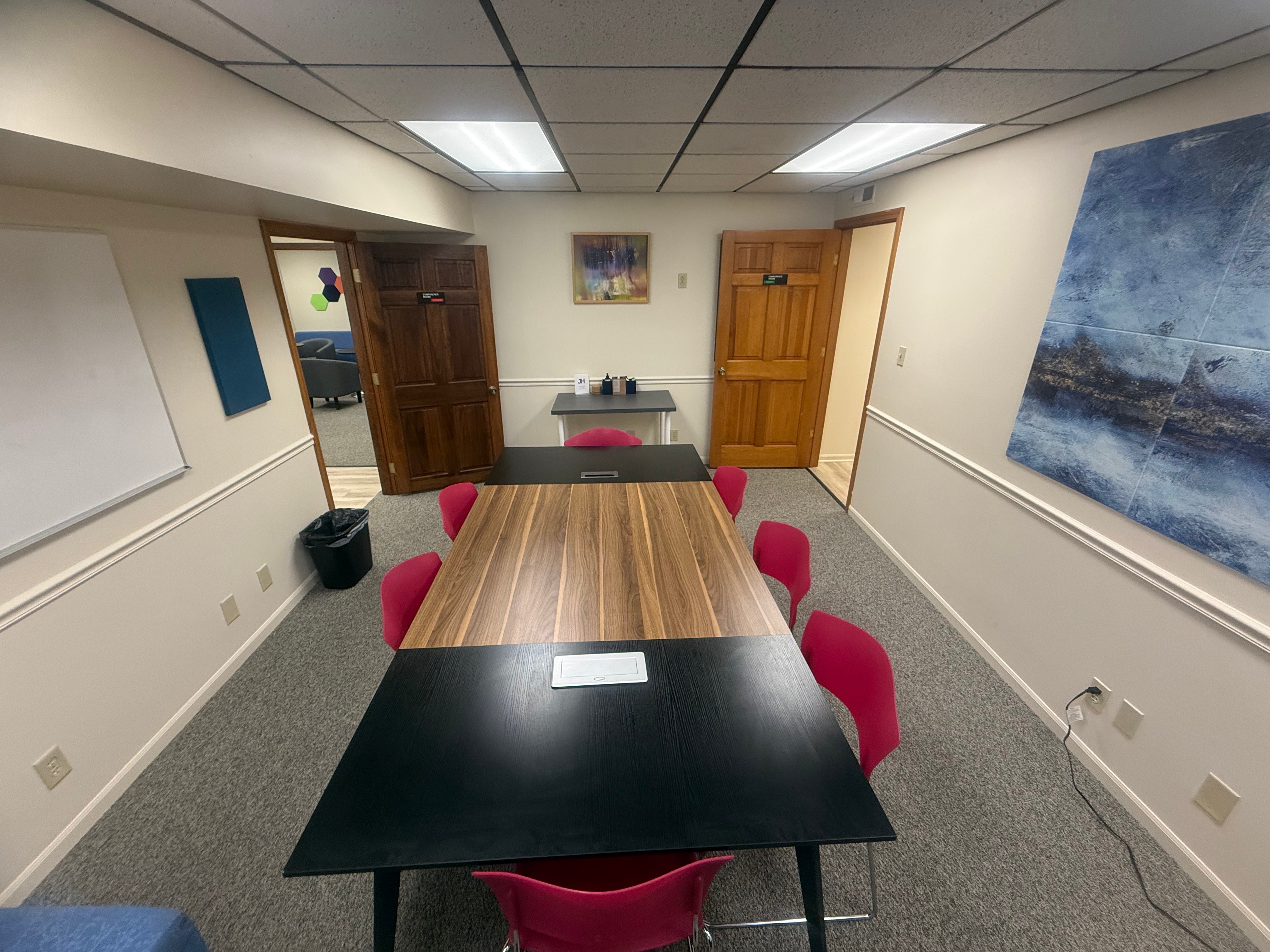 Our conference room serves 1-8 people comfortably, making it an ideal setting for teleconference meetings, focused discussions, brainstorming sessions, and strategic planning. Arrangements can be made to accommodate additional people when needed.
